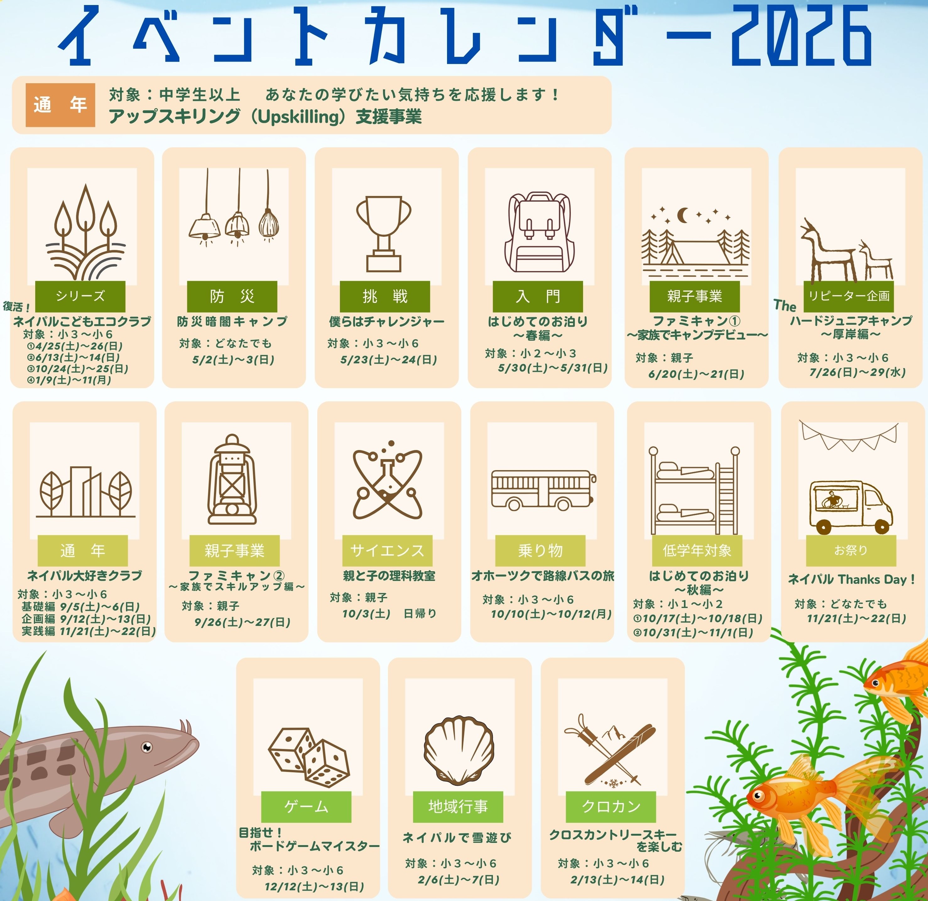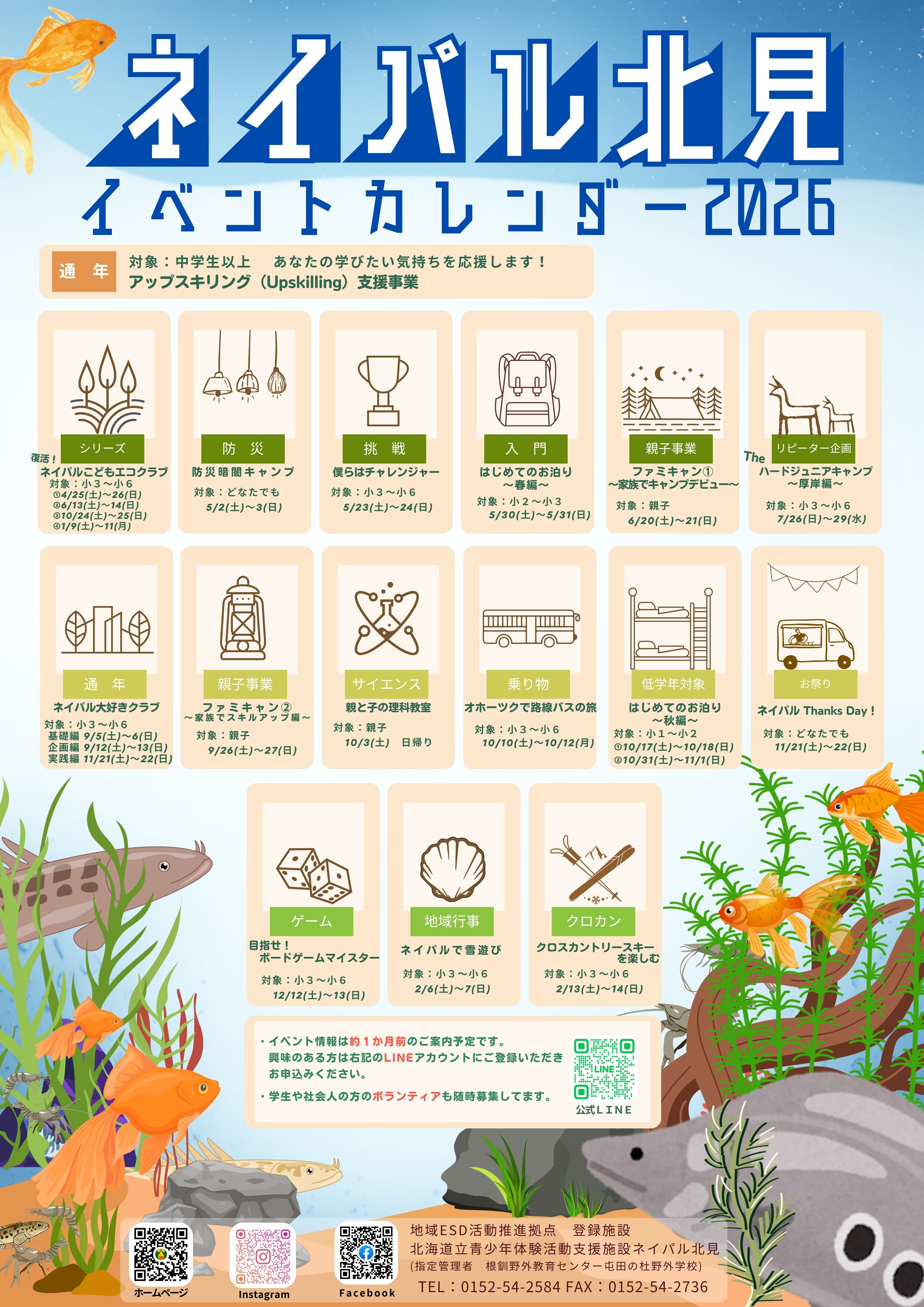 - ネイパル北見令和8年度のイベントカレンダーを公開しました。LINEでイベント情報を発信します!ご登録いただき、イベントにお申込ください。また、学生や社会人の方のボランティアも随時募集しております。
